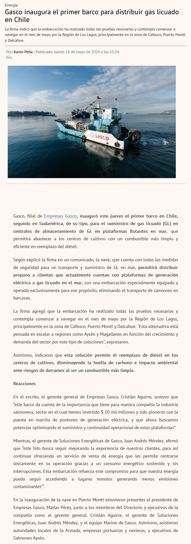 Se inicia operación del primer barco que distribuye gas licuado en Chile - (El Mercurio de Santiago)