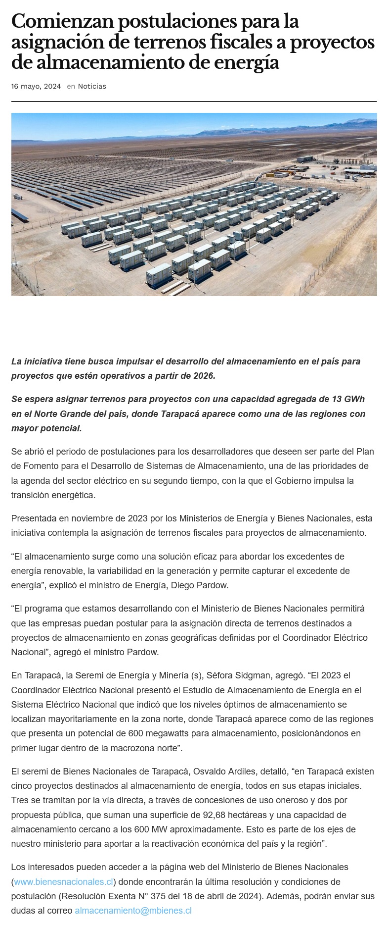Comienzan postulaciones para la asignación de terrenos fiscales a proyectos de almacenamiento de energía - (elsoldeiquique)
