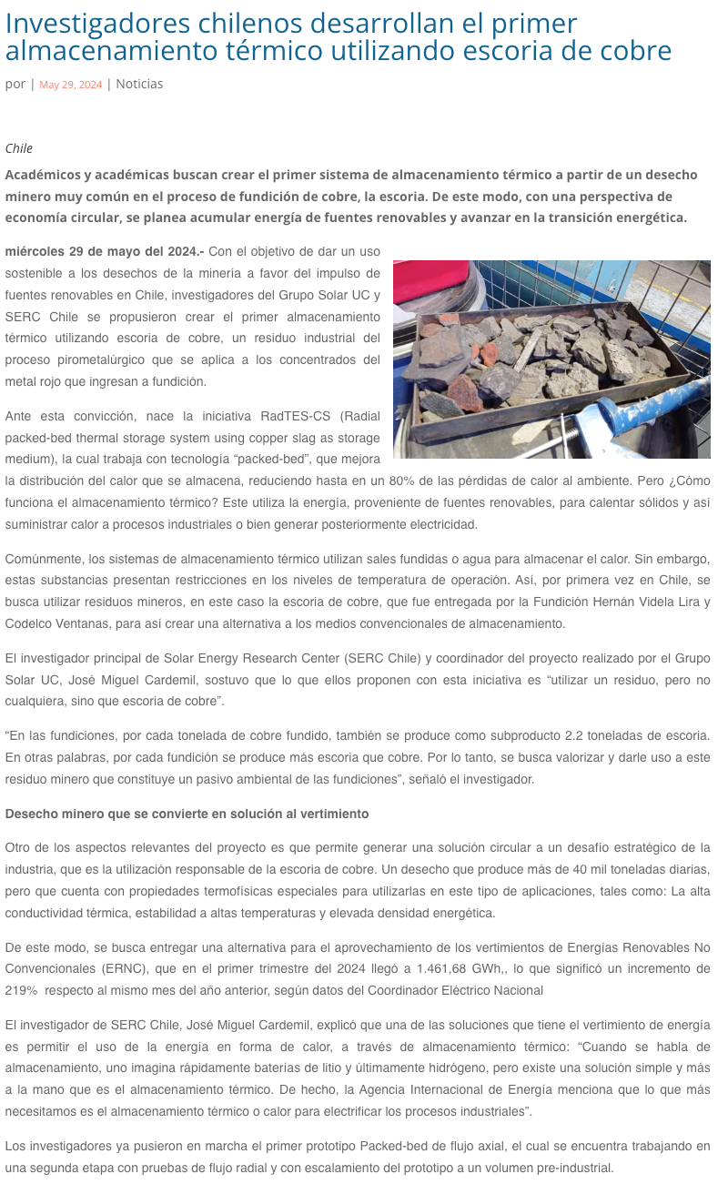 Investigadores chilenos desarrollan almacenamiento térmico con escoria de cobre - (mineriayfuturo.cl)