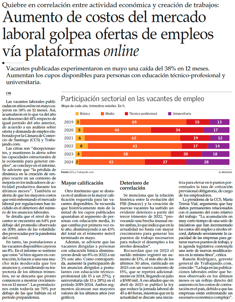 Menor crecimiento y deterioro del mercado laboral golpean el “retorno educacional” - (El Mercurio de Santiago)