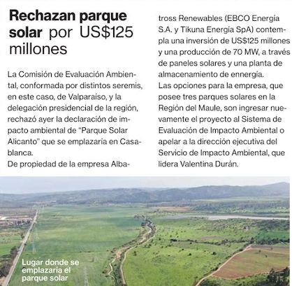 Rechazan proyecto solar y empresa evalúa apelación - (El Mercurio de Valparaíso)
