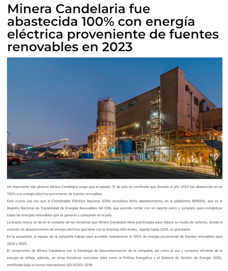 Minera Candelaria fue abastecida 100% con energía eléctrica proveniente de fuentes renovables en 2023 - (tierramarillano.cl)