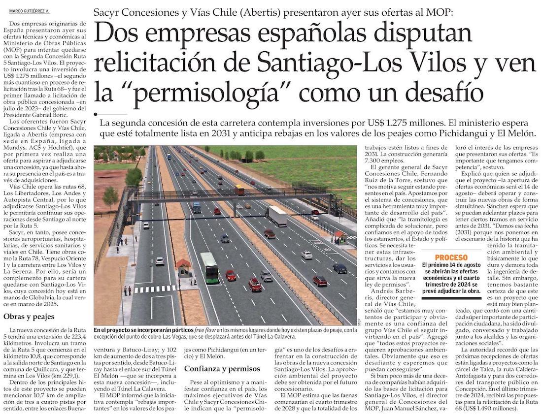 MOP recibe dos ofertas técnicas para nueva concesión de la Ruta 5 Santiago-Los Vilos - (Pulso)