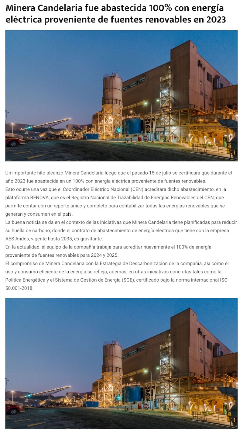 Minera Candelaria fue abastecida 100% con energía eléctrica proveniente de fuentes renovables en 2023 - (elzorronortino.cl)