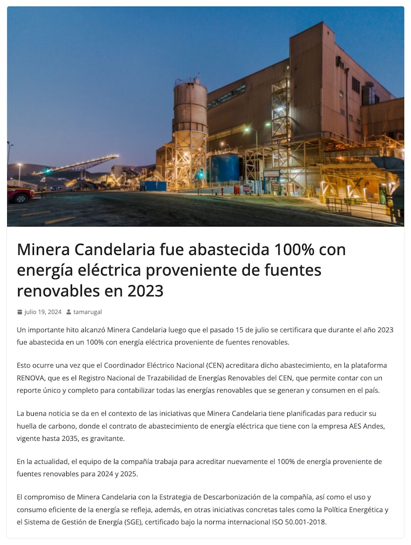 Minera Candelaria fue abastecida 100% con energía eléctrica proveniente de fuentes renovables en 2023 - (elzorronortino.cl)