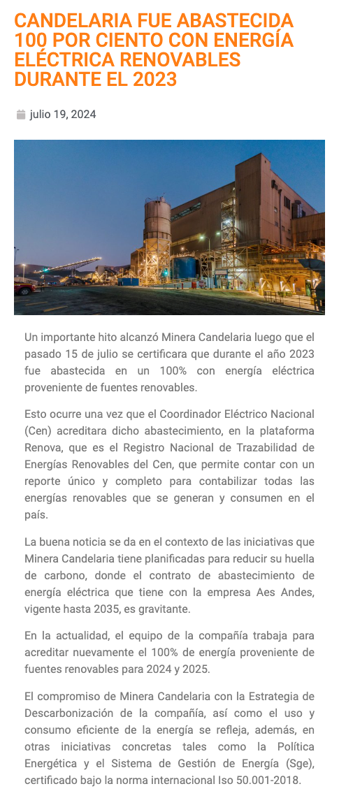 Minera Candelaria fue abastecida 100% con energía eléctrica proveniente de fuentes renovables en 2023 - (elzorronortino.cl)