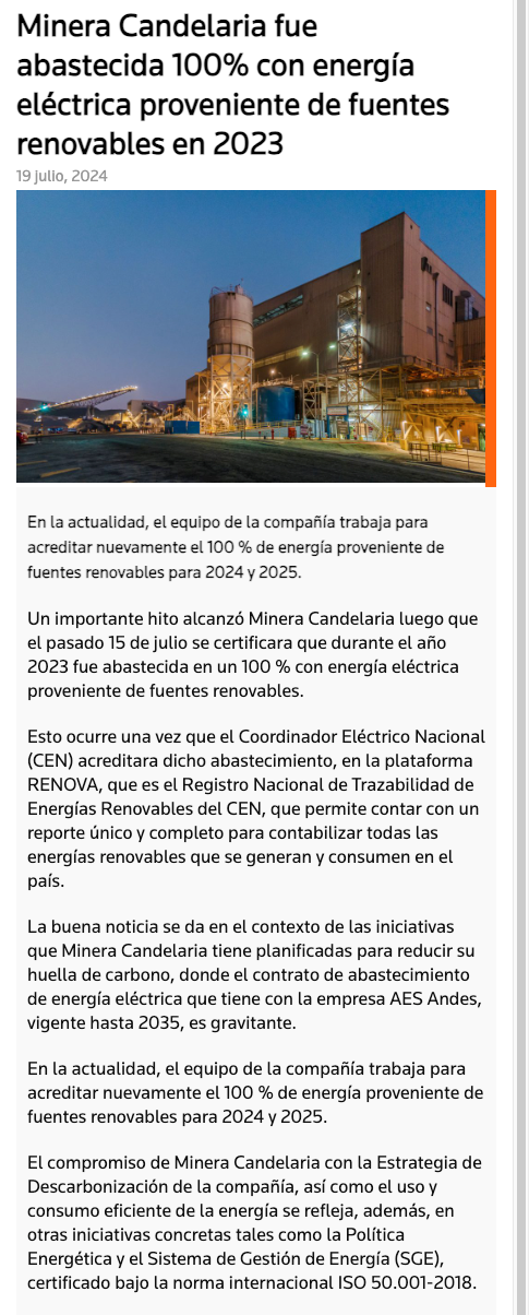 Minera Candelaria fue abastecida 100% con energía eléctrica proveniente de fuentes renovables en 2023 - (elzorronortino.cl)