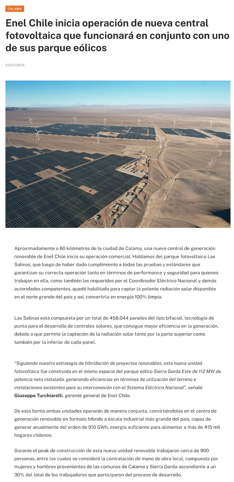 Enel Chile inicia operación comercial de nueva central fotovoltaica que funcionará de manera conjunta con uno de sus parques eólicos - (paiscircular.cl)