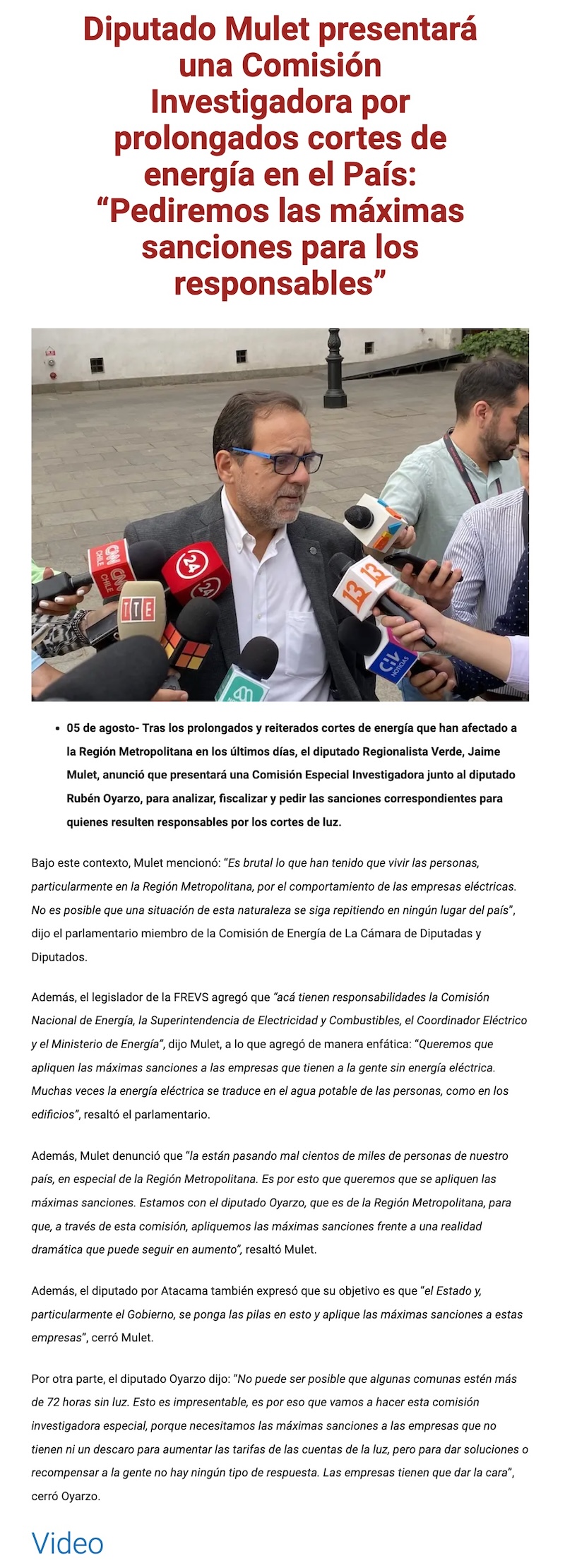 Diputado Mulet presentará una Comisión Investigadora por prolongados cortes de energía en el País: "Pediremos las máximas sanciones para los responsables" - (chanarcillo.cl)