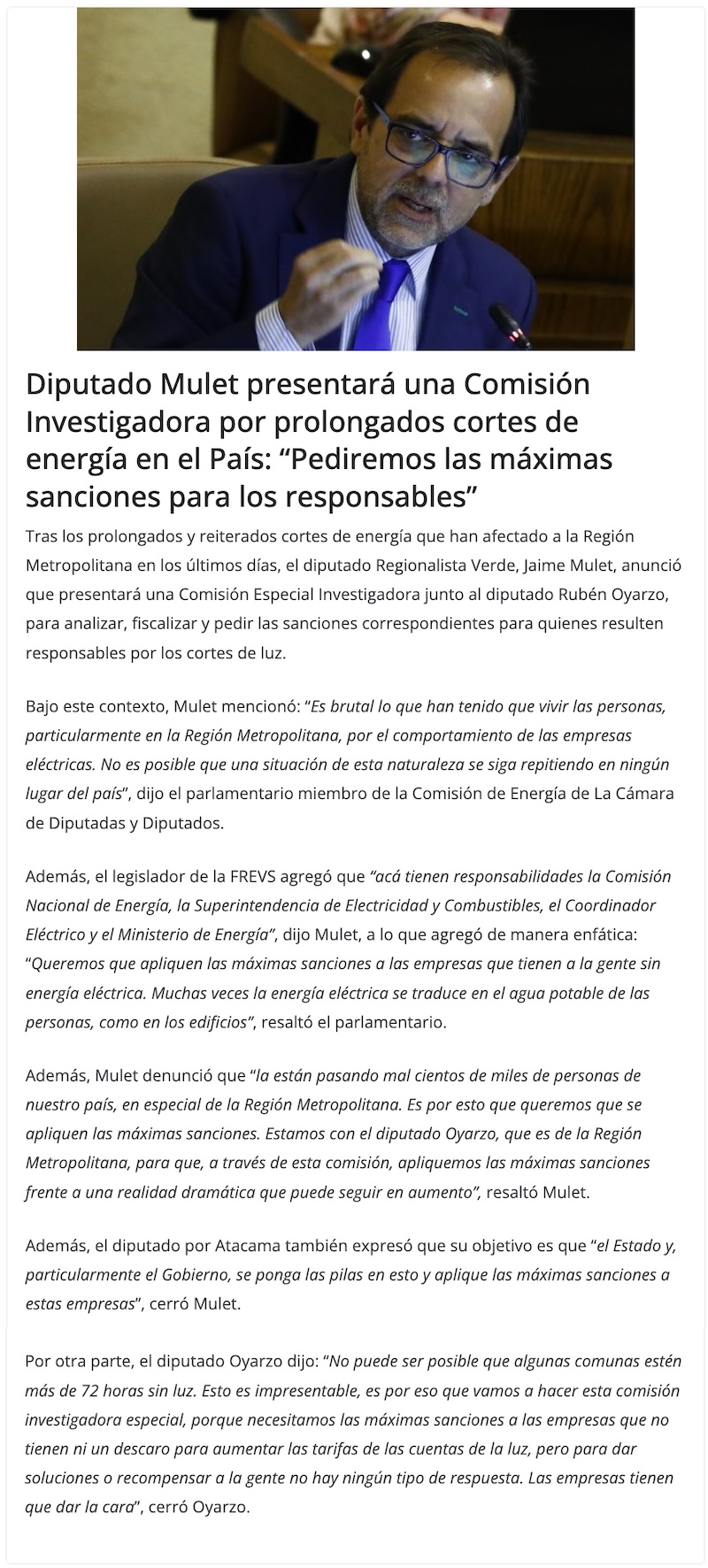 Diputado Mulet presentará una Comisión Investigadora por prolongados cortes de energía en el País: "Pediremos las máximas sanciones para los responsables" - (subelaradio.cl)