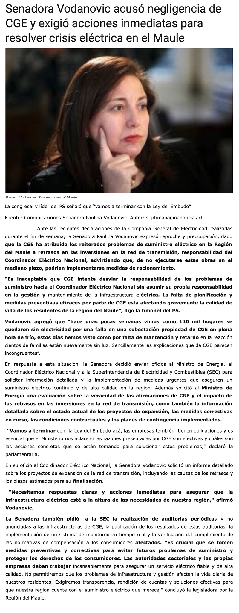 Senadora Vodanovic acusó negligencia de CGE y exigió soluciones por problemas eléctricos en Maule - (vlnradio.cl)