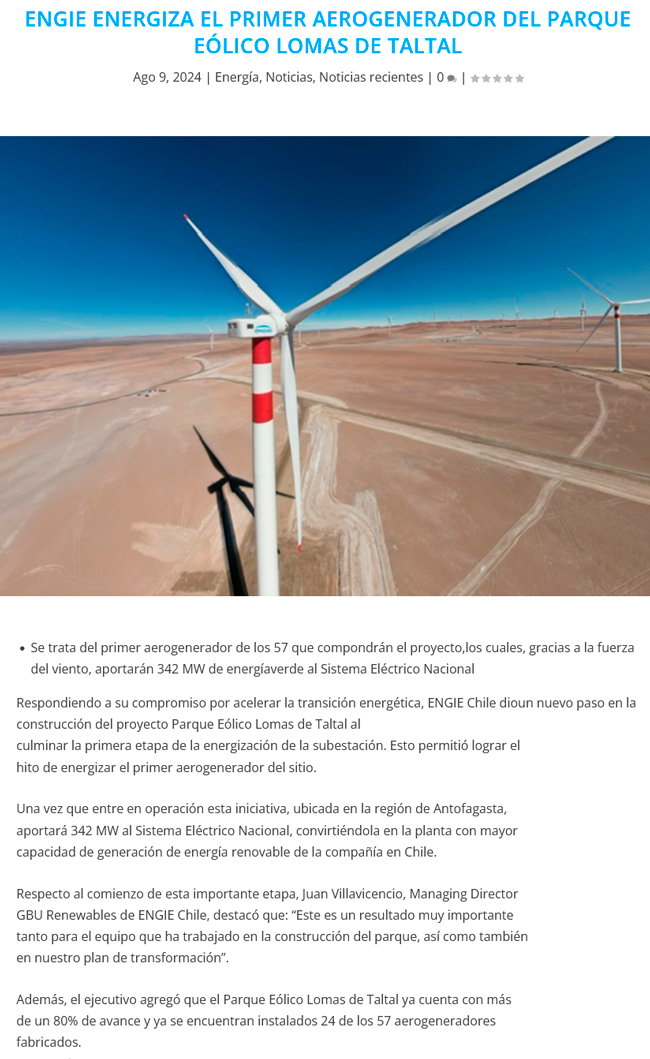 Energizan primer aerogenerador del Parque Eólico Lomas de Taltal - (La Estrella)