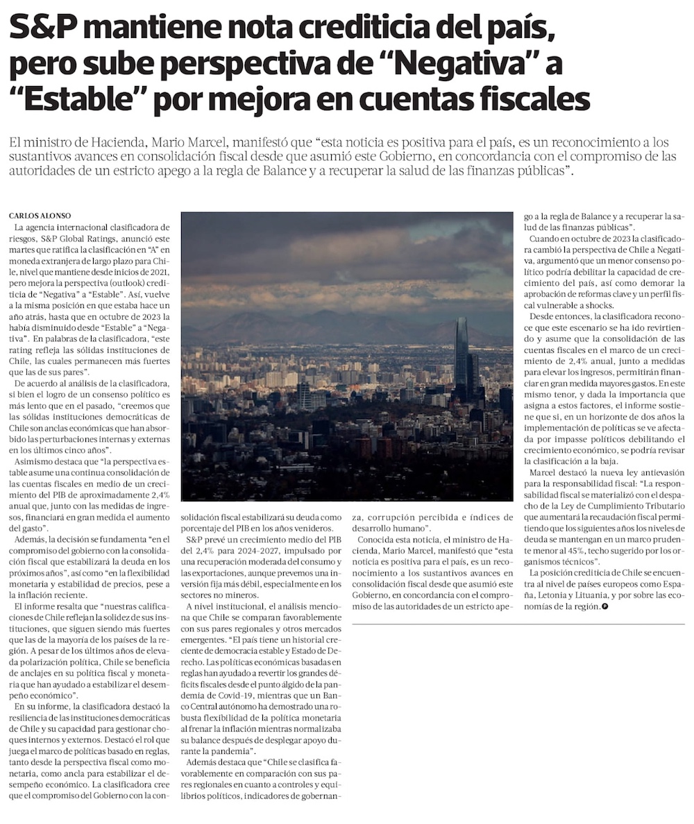 S&P revierte perspectiva negativa de Chile por primera vez en 7 años - (El Mercurio de Santiago)