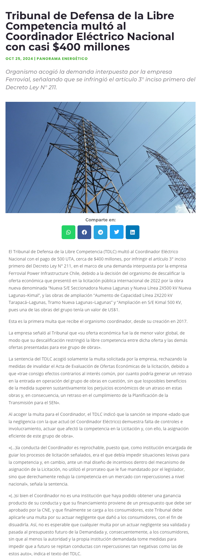TDLC concluye que Coordinador Eléctrico restringió la competencia en licitación de obras de transmisión y lo multa por su “actuar negligente” - (Diario Financiero)