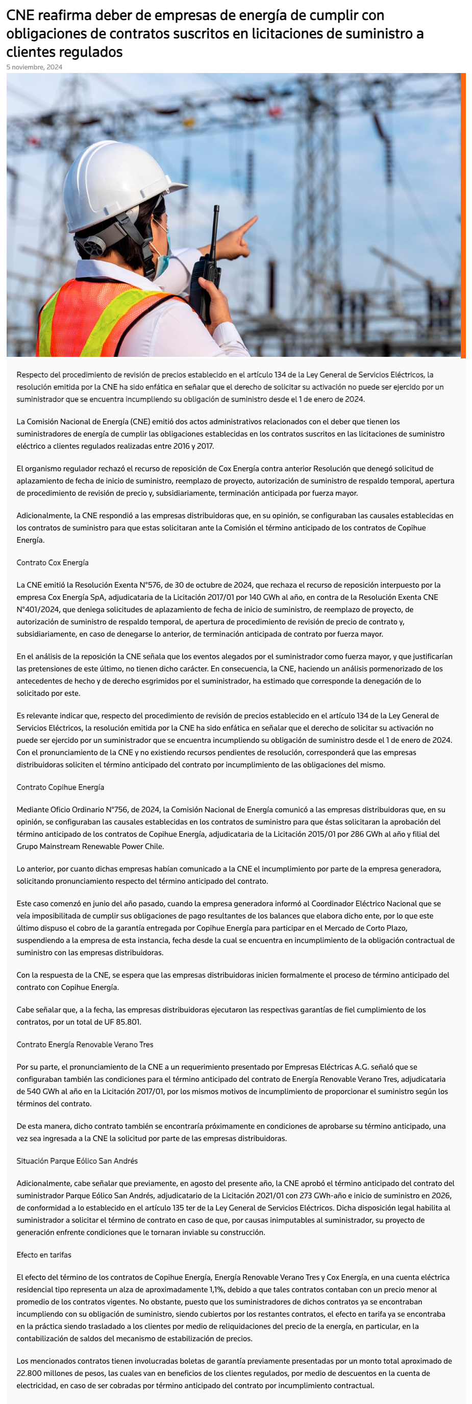 Crisis de las renovables: CNE deja en manos de distribuidoras el futuro de tres contratos de suministro en incumplimiento - (La Tercera Online)