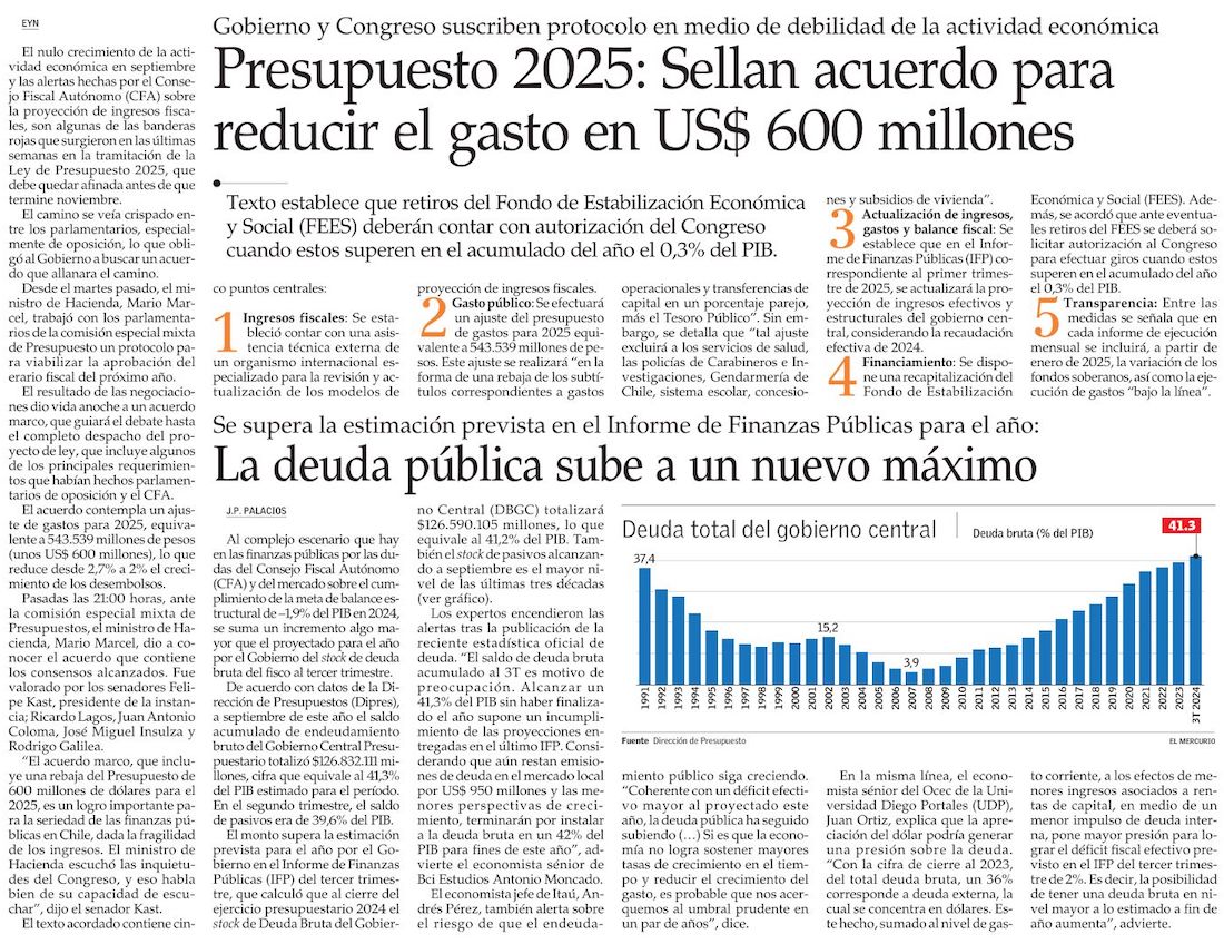Hacienda propone acuerdo para destrabar Presupuesto y ofrece mayor recorte de gasto en 2025 - (Diario Financiero)