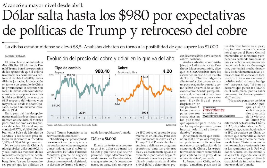 Vuelve el fantasma del dólar a $1.000 luego del triunfo de Trump y los malos datos de China - (Pulso)