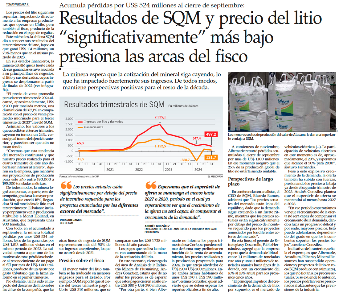 Ingresos de SQM caen más de 40% y precios del litio seguirían bajo presión - (Diario Financiero)