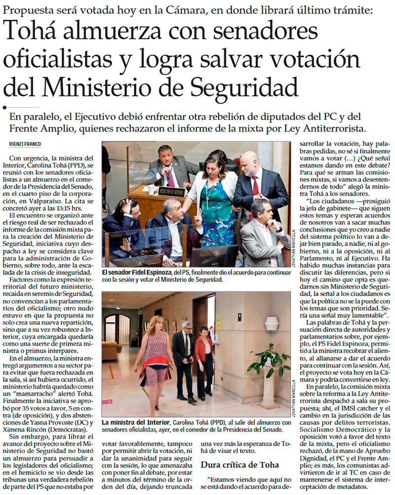 Ministerio de Seguridad: proyecto estrella de Tohá queda a un paso de ser ley - (La Tercera)