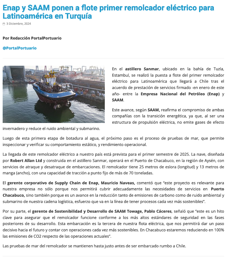 Primer remolcador eléctrico para Latinoamérica en Turquía de Enap y SAAM prepara su viaje a Chile - (La Tercera Online)