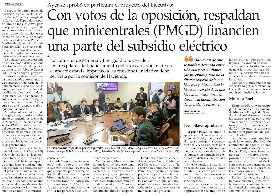 Diputados aprueban polémico pilar PMGD y Gobierno logra tres vías para financiar subsidio eléctrico - (Diario Financiero)