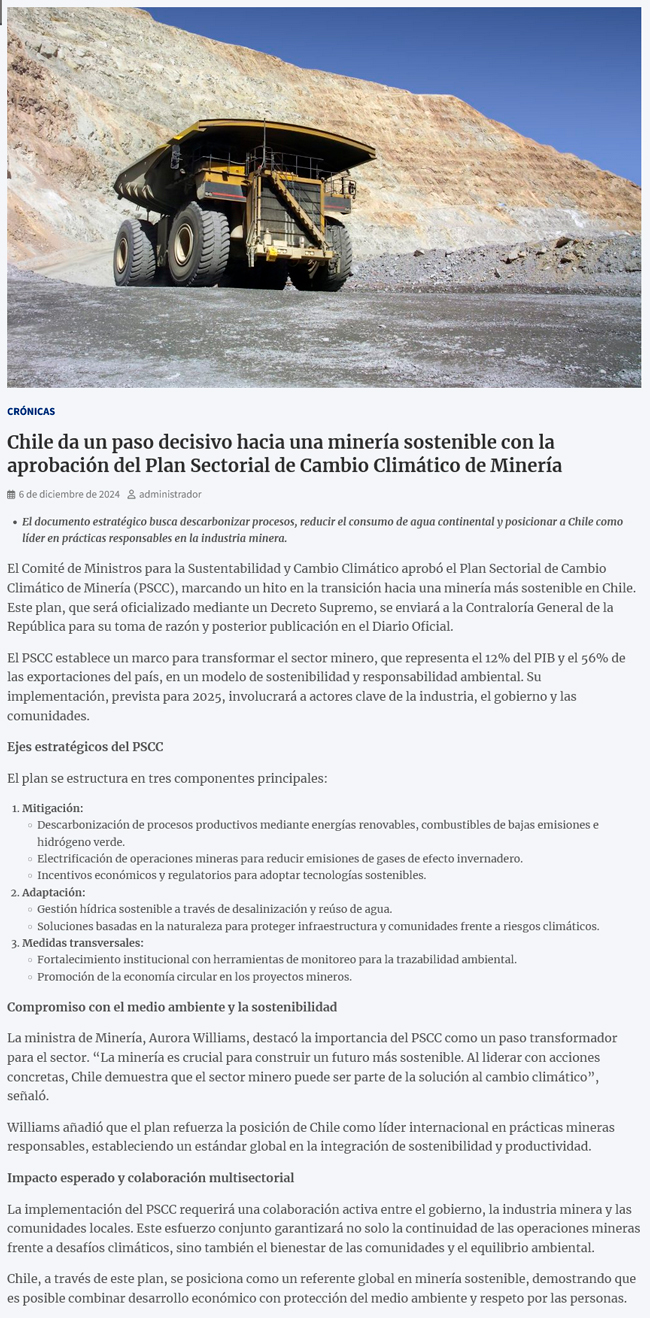 Chile avanza hacia una minería sostenible con la aprobación del Plan Sectorial de Cambio Climático - (biobiochile online)