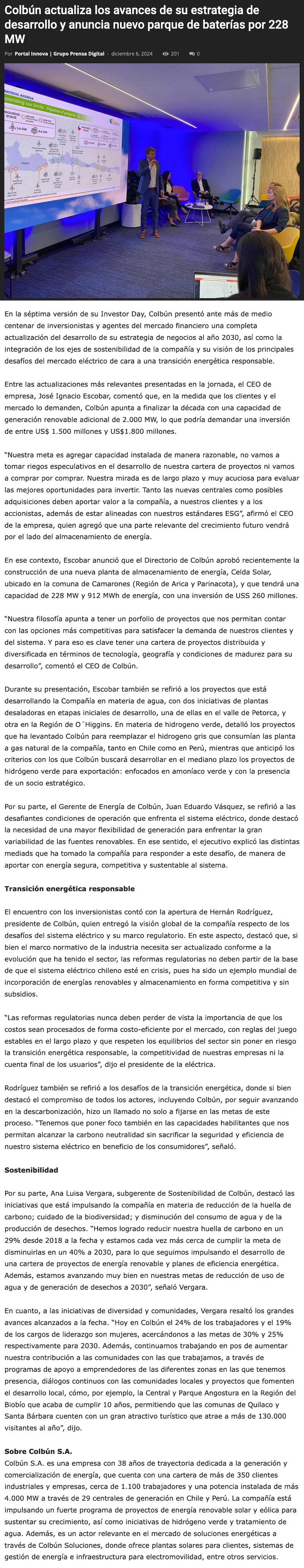 Colbún actualiza los avances de su estrategia de desarrollo y anuncia nuevo parque de baterías por 228 MW - (portalminero)