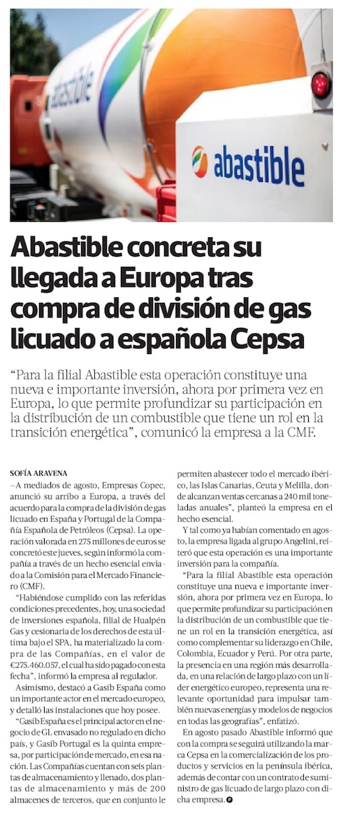 Abastible sella su arribo a Europa: concreta compra de operación de gas licuado en España y Portugal - (Diario Financiero)
