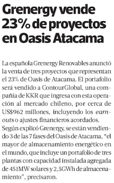 Grenergy vende proyectos por US$ 962 millones - (El Mercurio de Santiago)