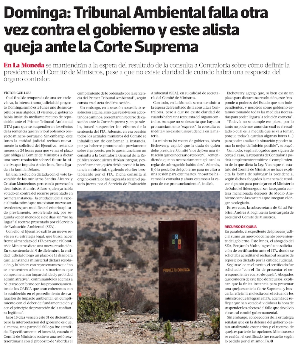 Dominga: Gobierno esperará a Contraloría para conformar Comité de Ministros y votar proyecto - (Diario Financiero)