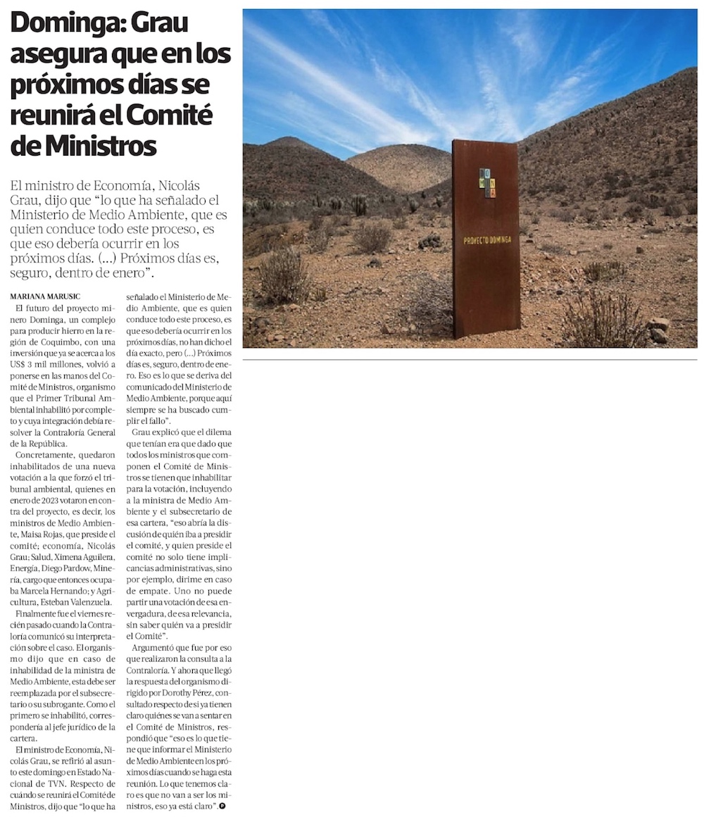 Comité de Ministros sesionará “en los próximos días” por proyecto Dominga - (El Mercurio de Santiago)