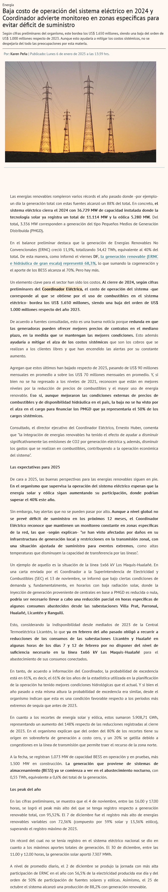 Baja costos de operación del sistema eléctrico en 2024 y Coordinador reconoce monitores en zonas específicas de la red - (Diario Financiero)