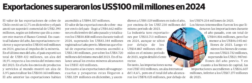 Cobre impulsa envíos chilenos a récord por US$ 100.000 millones y frutas desplazan a salmones al tercer lugar - (El Mercurio de Santiago)