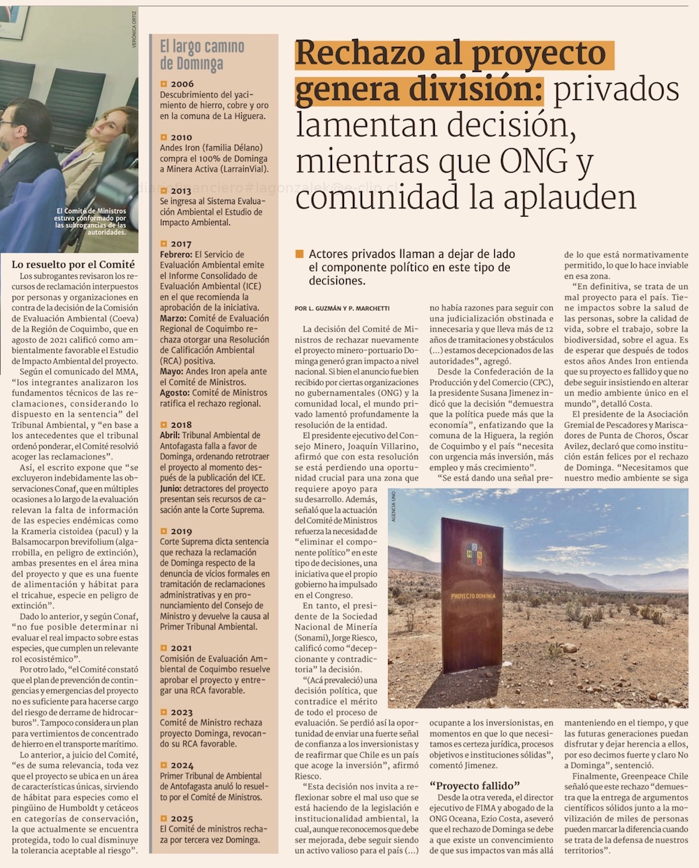 Con un integrante que se manifestó en contra del proyecto en 2022, Comité del Gobierno rechaza de nuevo Dominga - (El Mercurio de Santiago)
