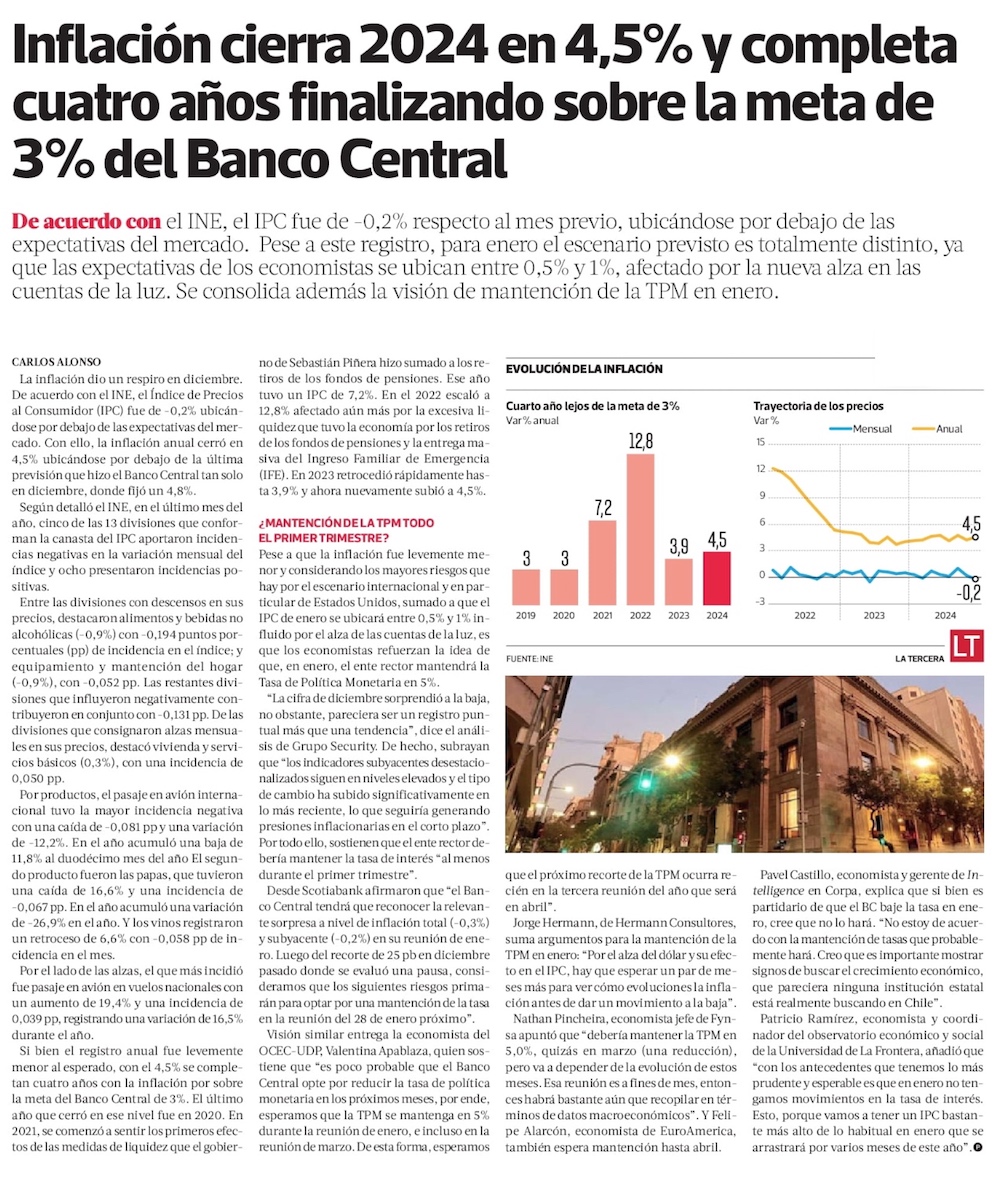 Inflación cierra por cuarto año seguido sobre la meta de 3% y mercado prevé un escenario aún desafiante en 2025 - (Diario Financiero)