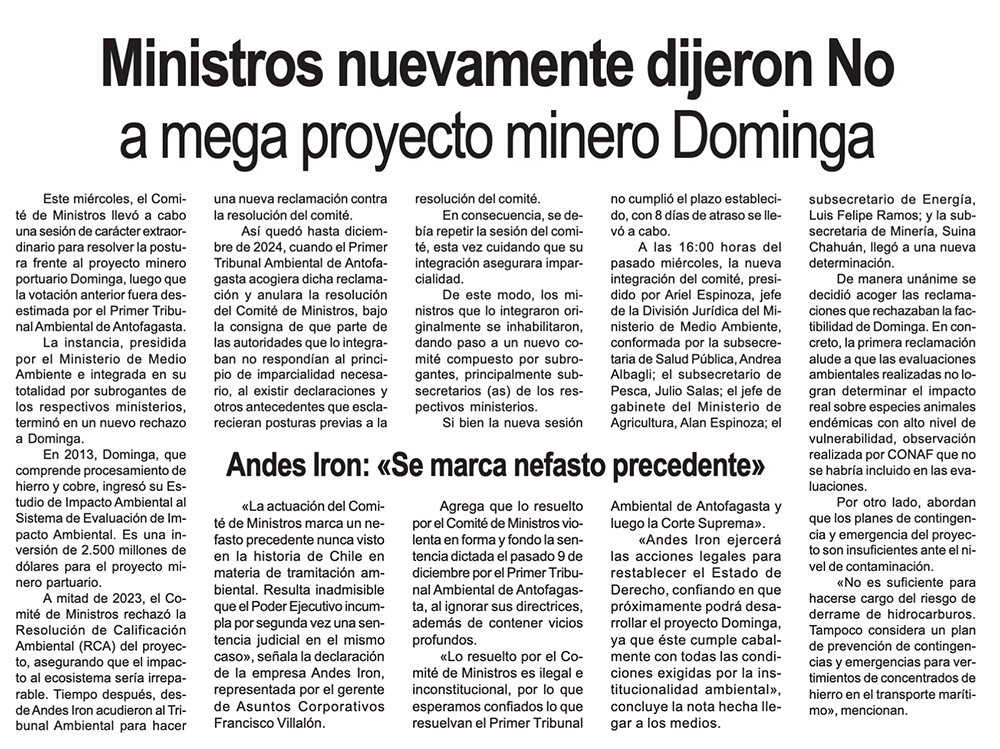 Comité de Ministros otra vez rechaza Dominga y empresa acusa “nefasto precedente, nunca visto en Chile” - (Diario Financiero)