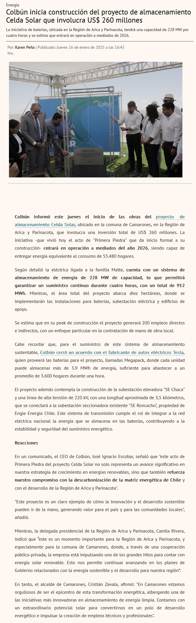 Colbún inició la construcción de “uno de los mayores proyectos de almacenamiento en Chile” - (La Tercera Online)