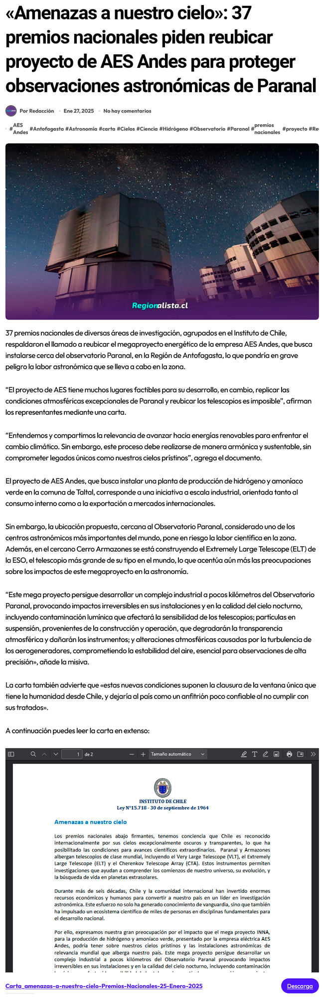 Premios nacionales critican posibles impactos de proyecto de AES Andes al observatorio Paranal - (Pulso)