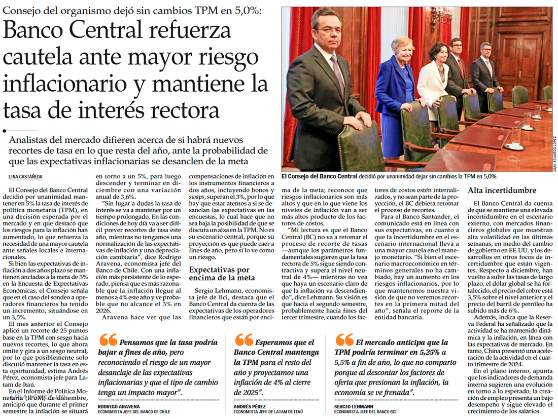 Banco Central mantiene la tasa por mayores riesgos y el mercado anticipa largo período de pausas - (Diario Financiero)