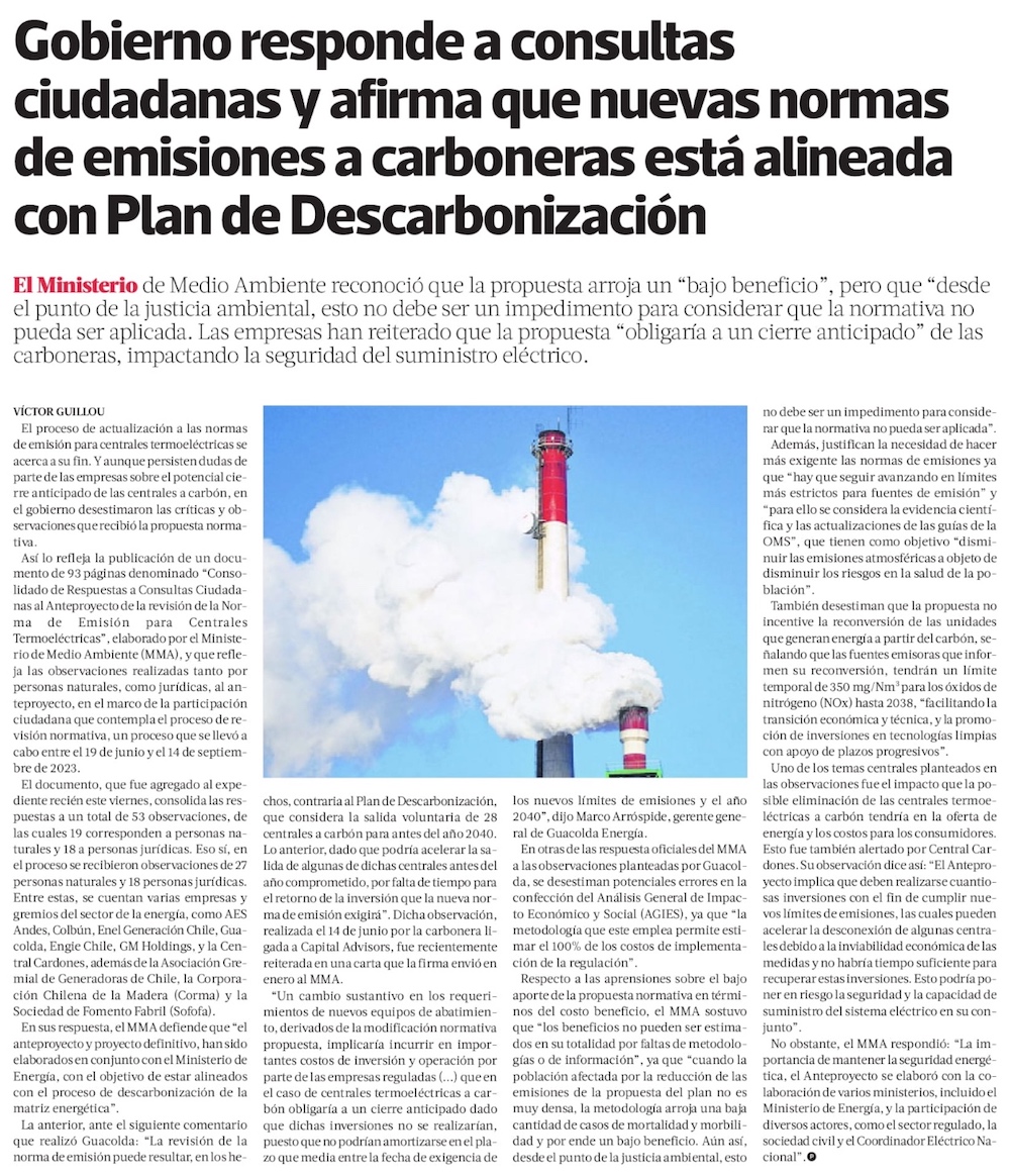 Gobierno responde a consultas ciudadanas y afirma que nuevas normas de emisiones a carboneras está alineada con Plan de Descarbonización - (La Tercera Online)