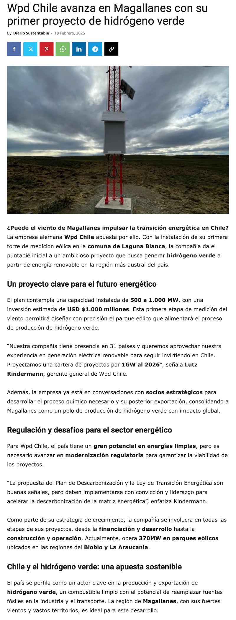 Wpd Chile ejecuta fase inicial de su proyecto de H2V en Magallanes con destacada inversión - (revistaei.cl)