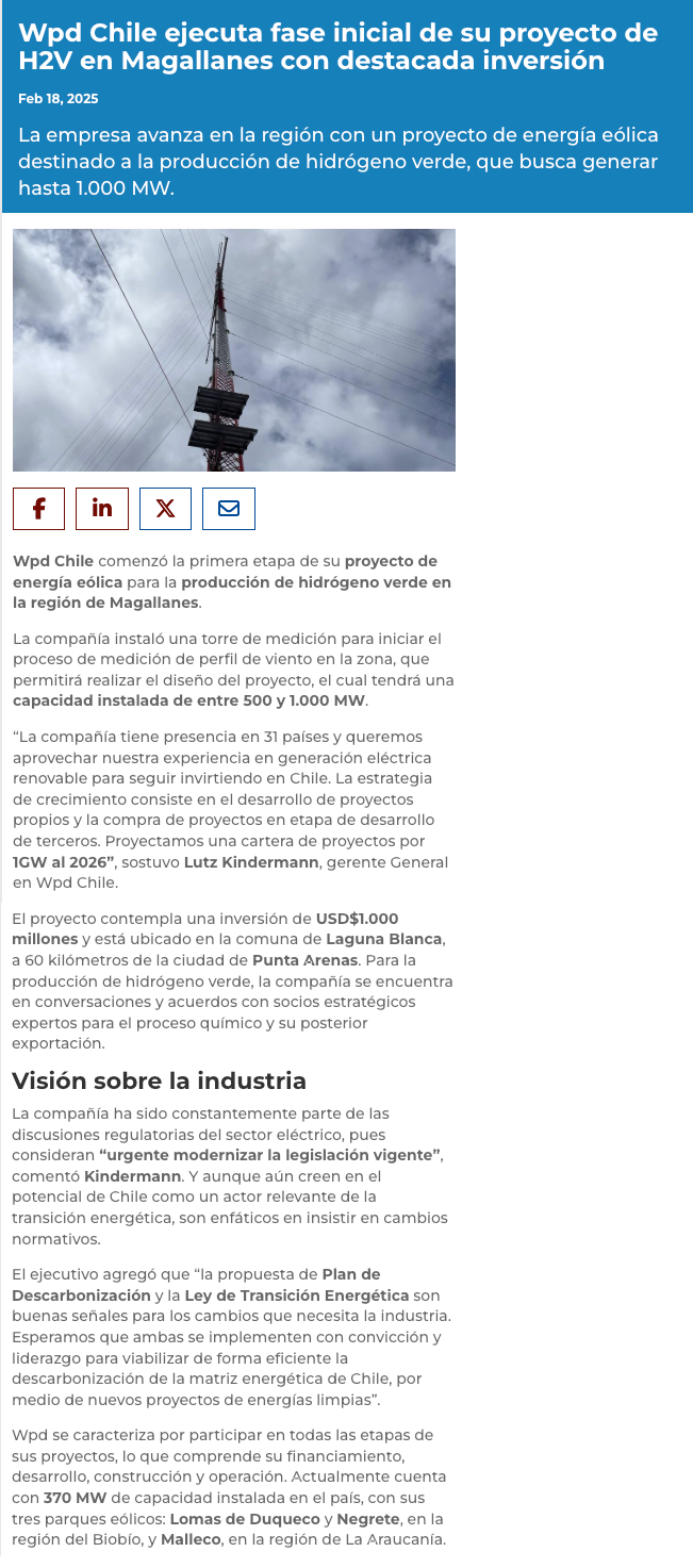Wpd Chile avanza en Magallanes con su primer proyecto de hidrógeno verde - (diariosustentable.com)