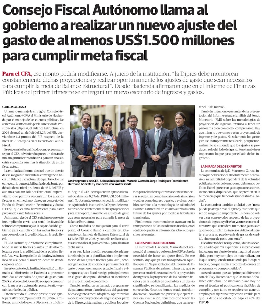 Ante desvío fiscal de “magnitud extraordinaria”, CFA teme erosión de la regla y pide bajar gasto - (El Mercurio de Santiago)