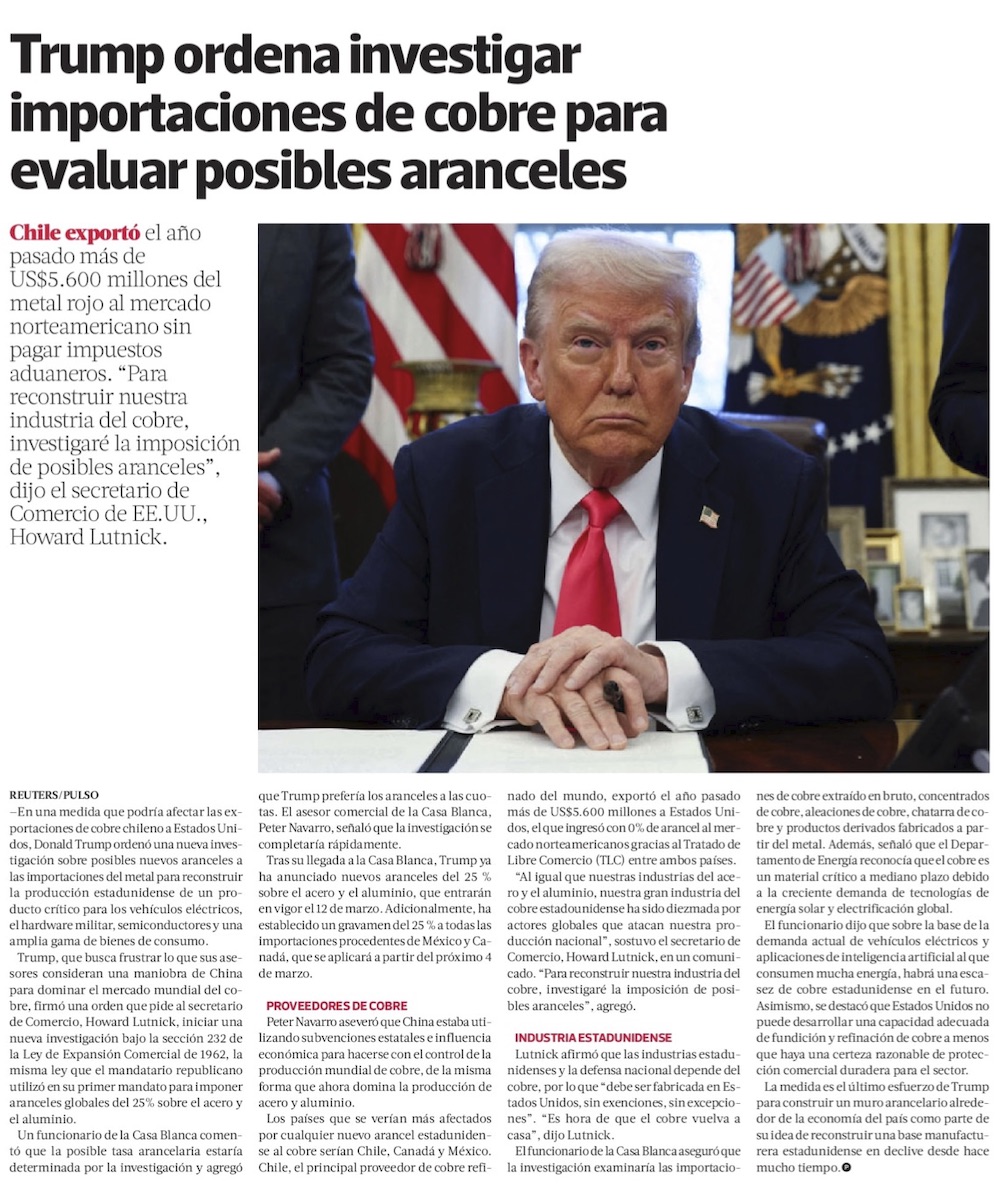 Trump ordena nueva investigación arancelaria sobre las importaciones de cobre - (Diario Financiero)