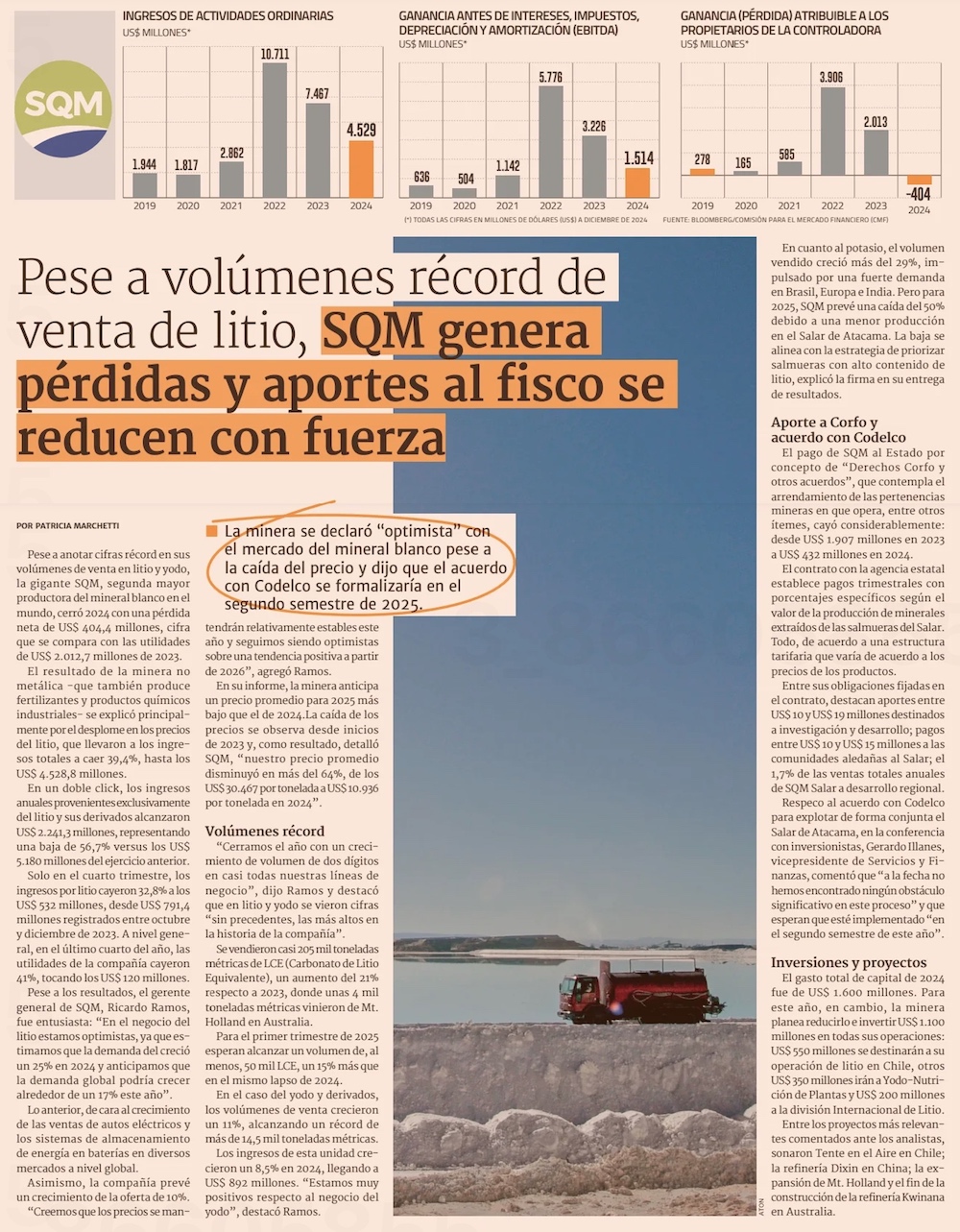 SQM pagó casi US$ 1.500 millones menos a Corfo en 2024 por baja en precio del litio - (Pulso)