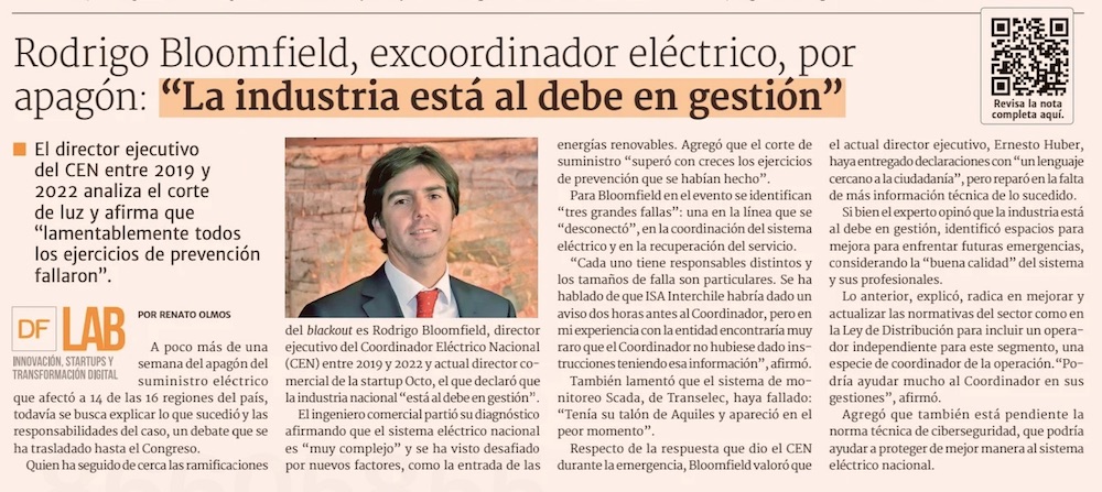 Rodrigo Bloomfield, excoordinador eléctrico, por apagón: “La industria está al debe en gestión” - (DF Online)