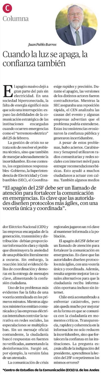 Cuando la luz se apaga, la confianza también - (Medios Regionales Cadena El Mercurio)