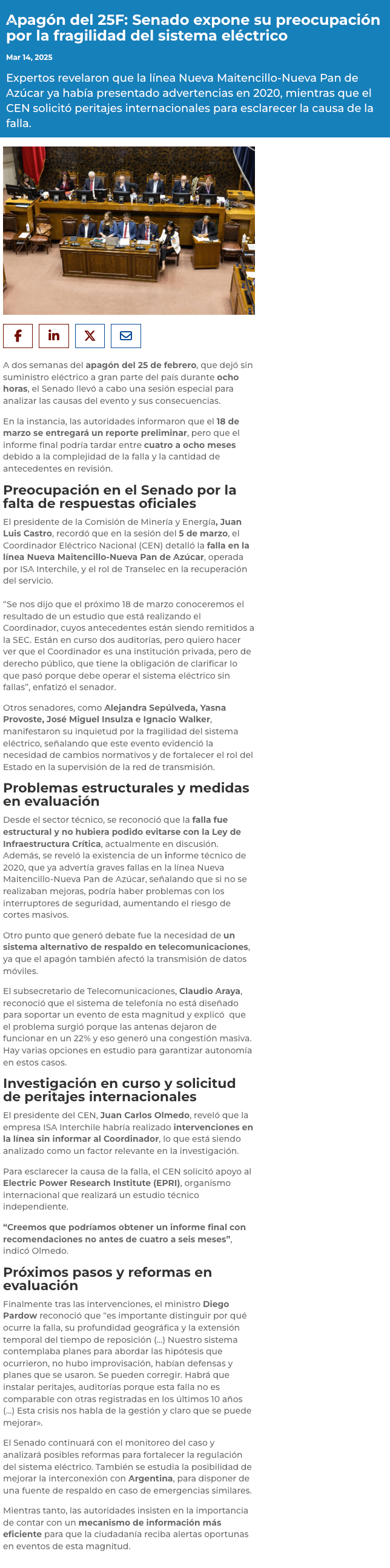 Apagón: Senadores cuestionaron que aún no se tenga una versión oficial del hecho - (El Heraldo (Linares))