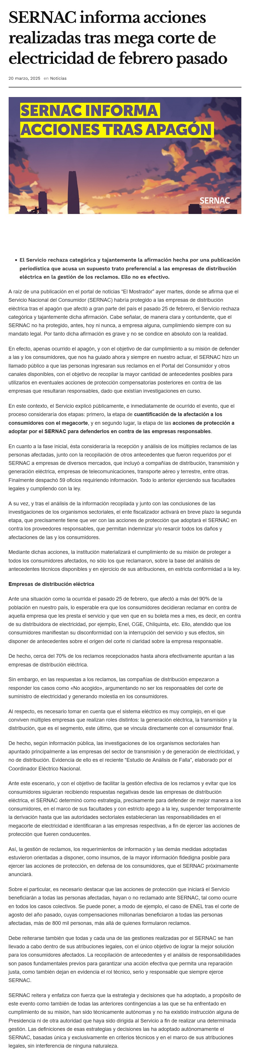 Sernac informa acciones realizadas tras mega corte de electricidad de febrero pasado - (radiovoltaje.cl)