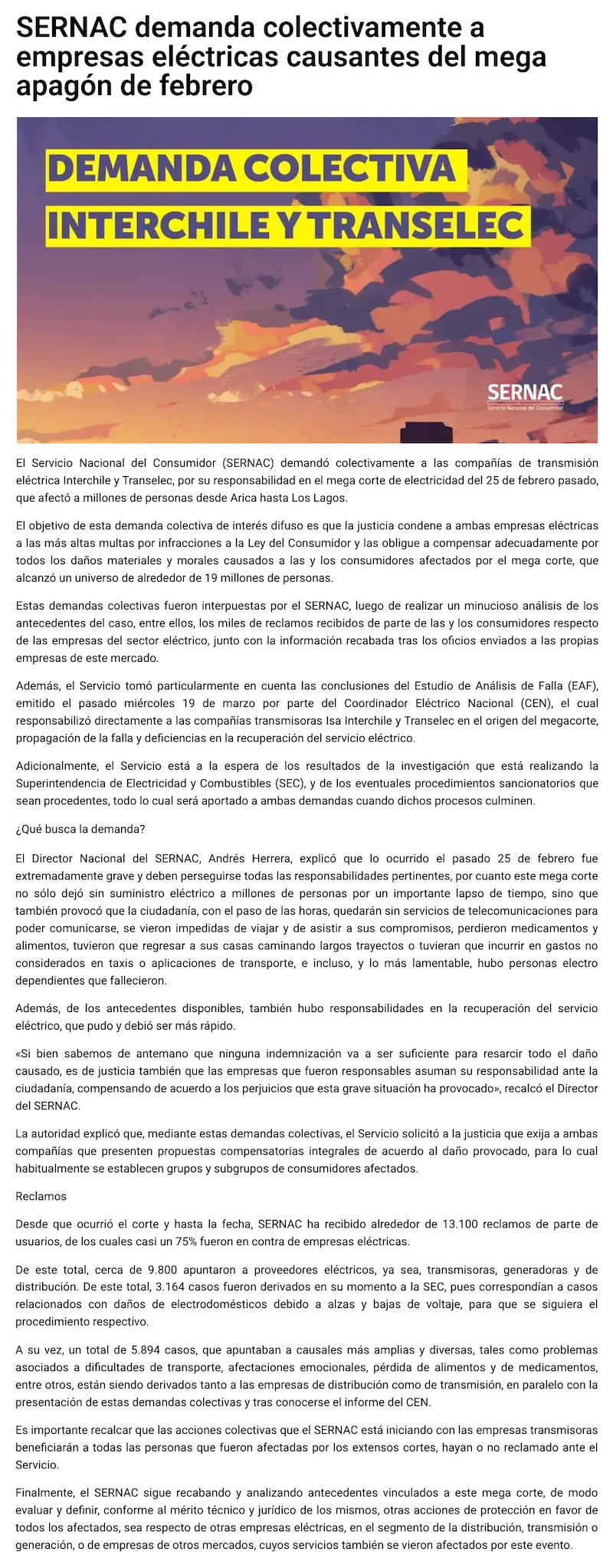 SERNAC demanda colectivamente a empresas eléctricas causantes del mega apagón de febrero pasado - (ceinoticias.cl)